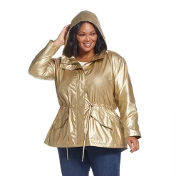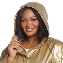 Featuring a smooth iridescent water-resistant woven construction, this women’s Weathercast metallic anorak jacket looks good and keeps you safe from the elements.